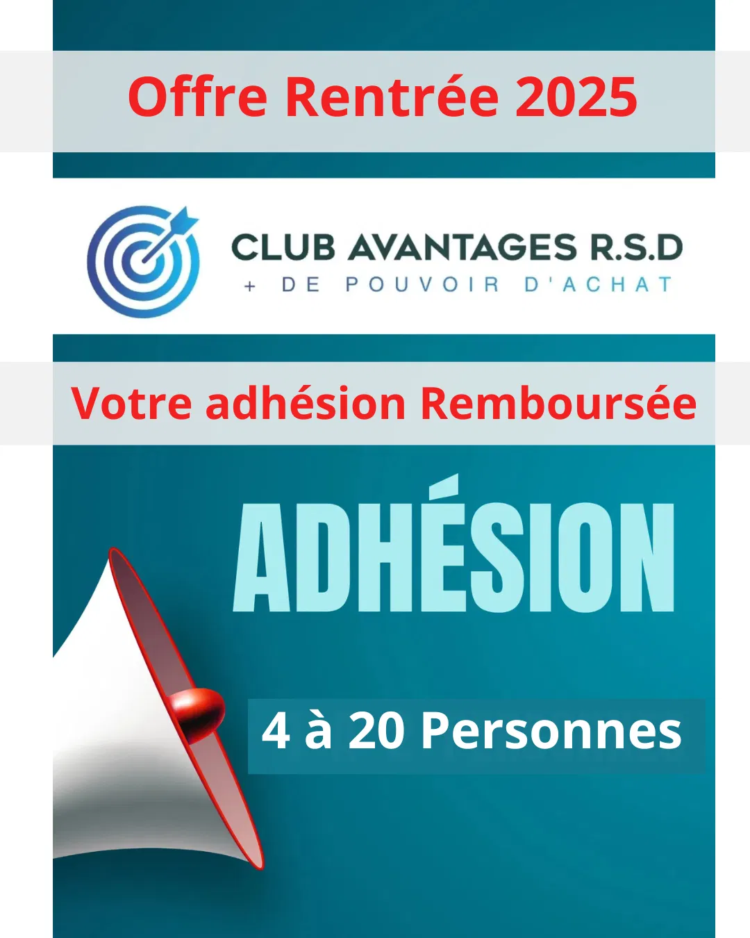 Adhésion au club avantages RSD valable 12 mois à compter de la validation . Selon le nombre de personnes dans l ' entreprise le prix par adhérent sera dégréssif. Contactez le 07 72 33 11 27 pour en parler et vous faire une offre Aperçu catalogue : https://www.clubavantages-rsd.com/catalogue-des-avantages-club Le coût de votre adhésion sera compensé par des bons de réductions de la même valeur distribué aux bénéficiaires :